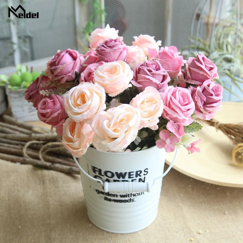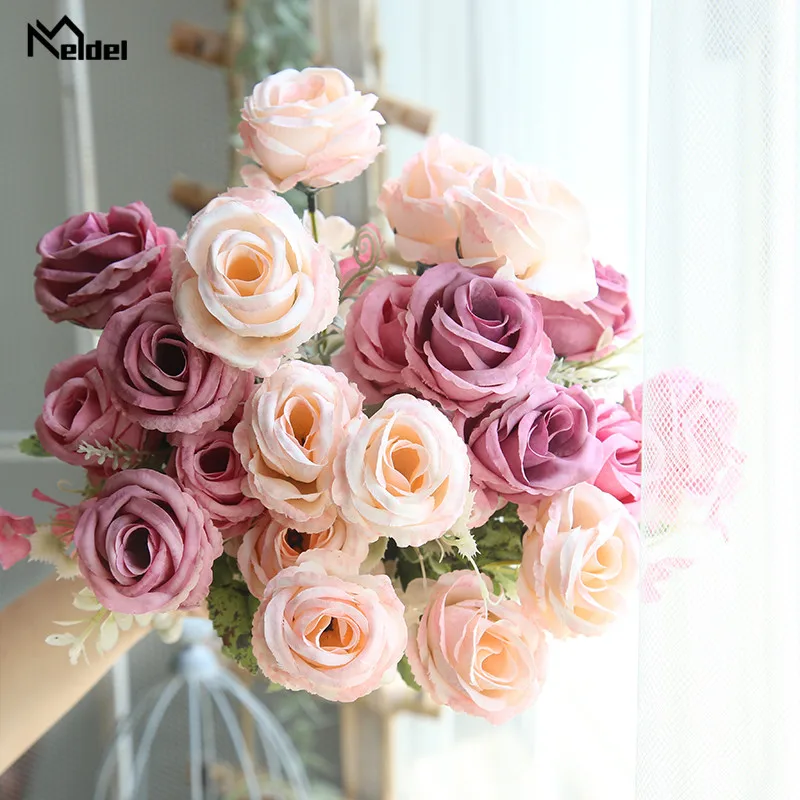 Meldel High Quality Fake Flowers 6 Heads Silk Roses Mariage Bridal Bouquet Wedding Home Decoration Mini Blue Flowers Artificial
